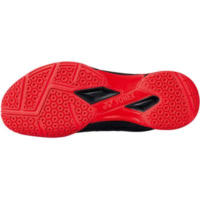 メーカー希望小売価格:9,200円(税別) カラー:(187)ブラック×レッド サイズ:22.0〜29.0cm 素材:アッパー/合成繊維、ミッドソール/合成樹脂、アウトソール/ゴム底仕様:バドミントン用 特長:ミッドカット、3E設計 機能1:パワークッション/ヨネックス独自開発の軽量衝撃吸収材。